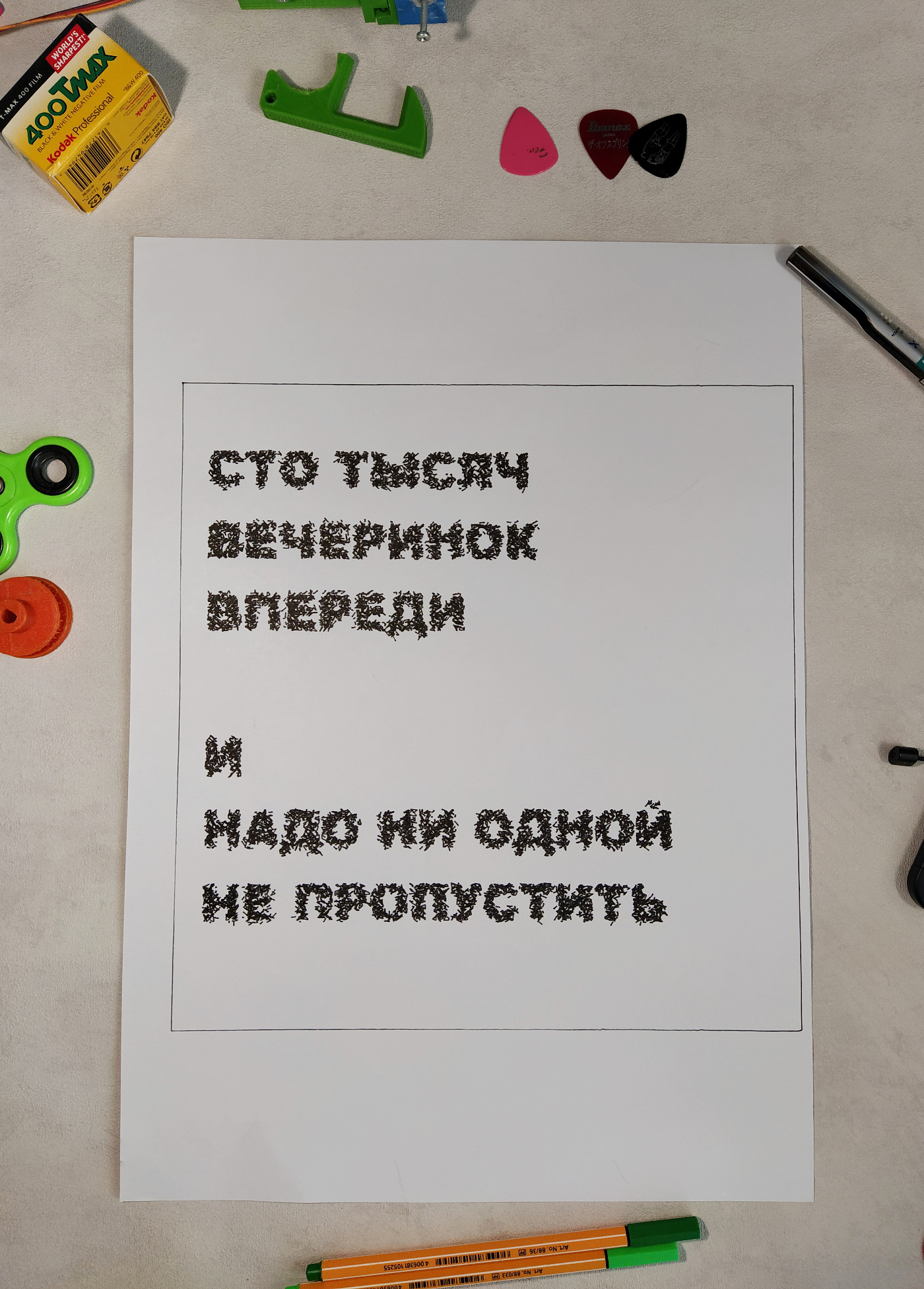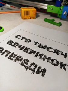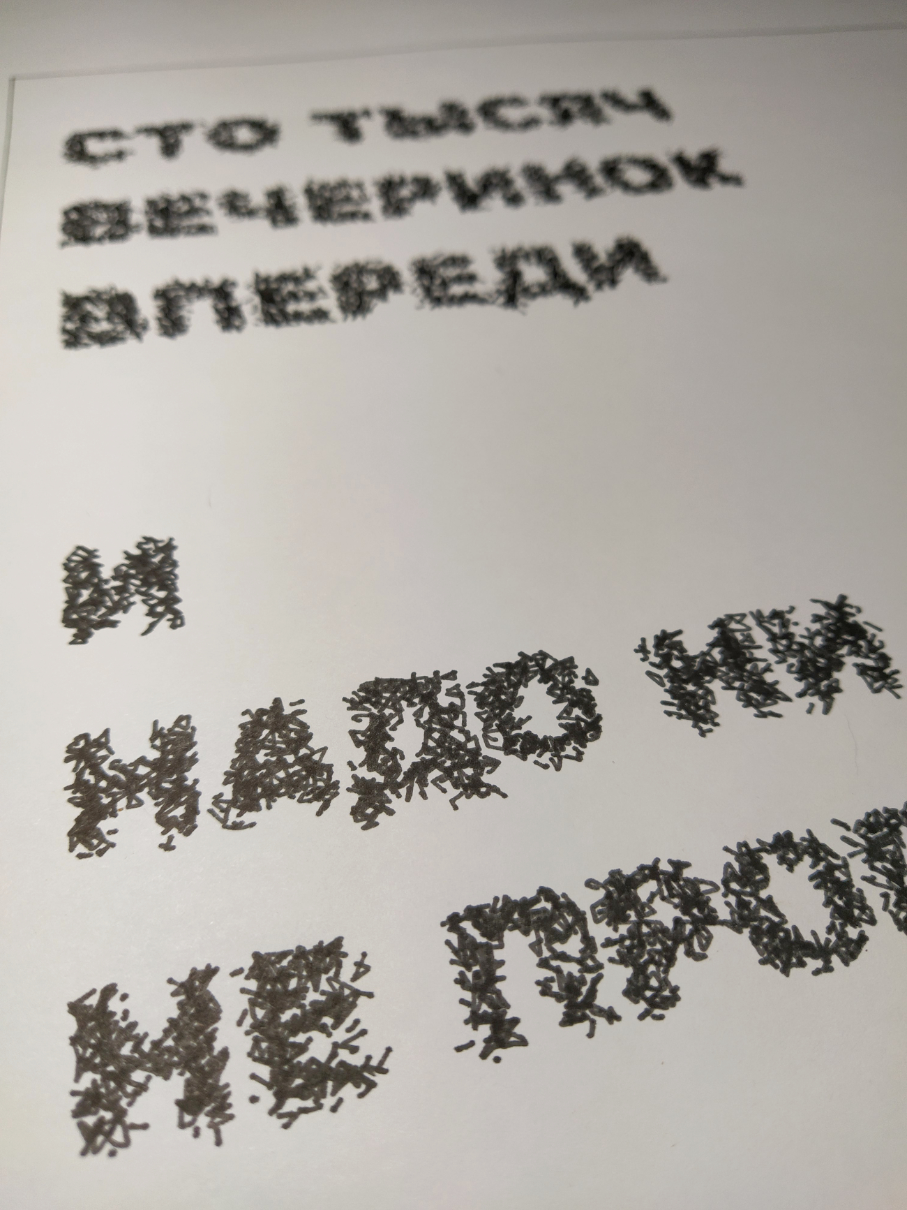 There are many pensee that I like. Mainly it is phrases from song lyrics (not banal dictums). This one is from here. There is no sense to just draw text (for me). So I decided to apply some kind of transformation. In this case, I converted the text into a set of lines that randomly (according to the brightness/darkness) fill the area. The lettering is a little more blurry, but still readable.